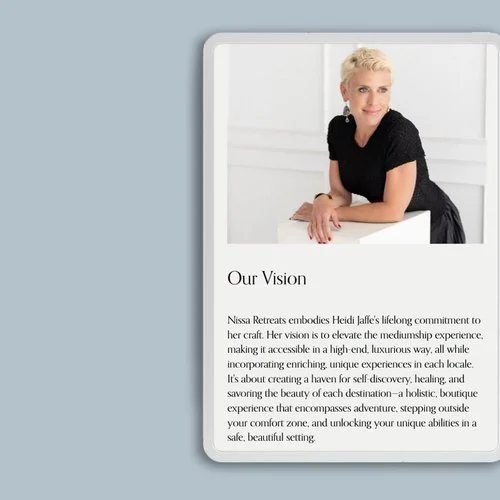 Collaborating with Psychic Medium Heidi Jaffe, we developed Nissa Retreats—a brand that blends spirituality, adventure, and luxury into transformative experiences. We built a cohesive brand strategy that reflects Heidi’s vision, paired with a seamless booking system designed to make retreat planning effortless for her clients.